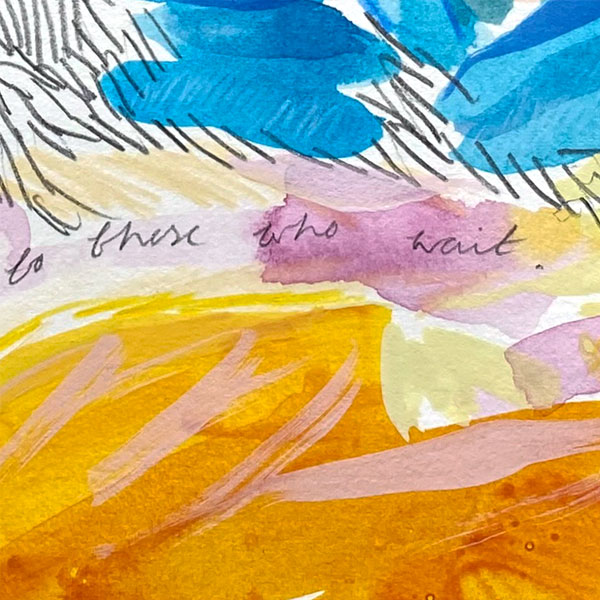 Fluid acrylic, coloured pencil and pencil on paper, 10″ x 12″, 2023.