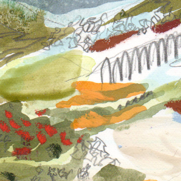 Acrylic, soft pastel and pencil on paper, 5″ x 6″, 2021.