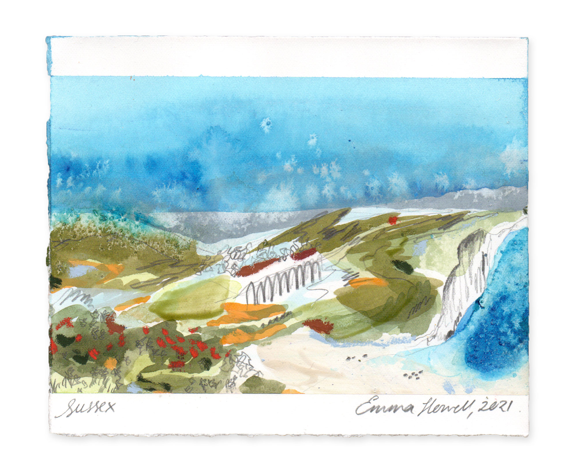 “Flint walls and rambling flowers. Swooping hills and valleys, with the cliffs into the sea as an abrupt end. Pretty villages and fairs on bright sunny days, muddy walks and cosy pubs filled with woodsmoke in the winter. Charleston Manor House and the Bloomsbury set, old creativity woven in. Bright greens, crisp whites, soft blues and moody greys, with the bright points of wildflowers.