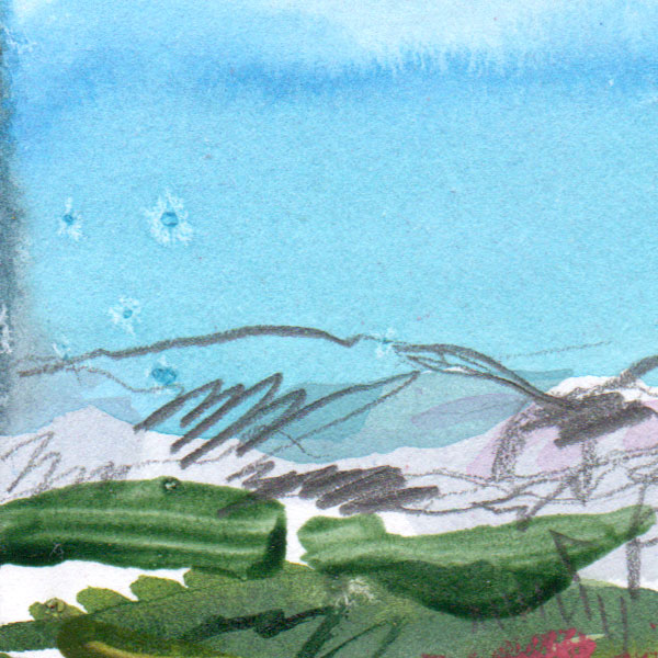 Acrylic, soft pastel and pencil on paper, 5″ x 6″, 2021.