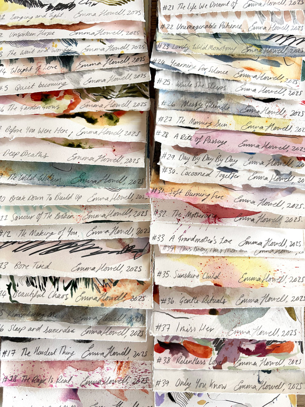 Before starting this body of work, I reached out to my audience, friends, collectors.. anyone who felt compelled to share.. and asked for their words on motherhood. Stories, poems, random words, confessions.. absolutely anything. I often invite others into my creative practice, and some past collections have grown from the stories and images people have sent me (81 Wild, Four Year Wild Fire and Snapshots). The Motherhood Collection continues that tradition.. these 50 artworks come from all of us, not just me.